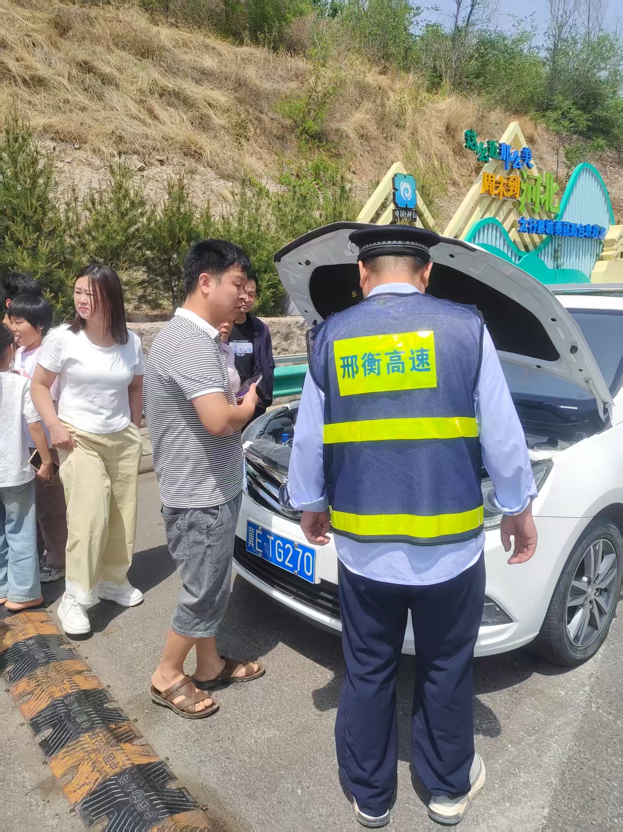5月4日中午,正值五一长假出行旅游高峰,一辆载着一家老小的汽车在坂上收费站突然抛锚。面对突发状况,司机一家焦急万分,不知所措。