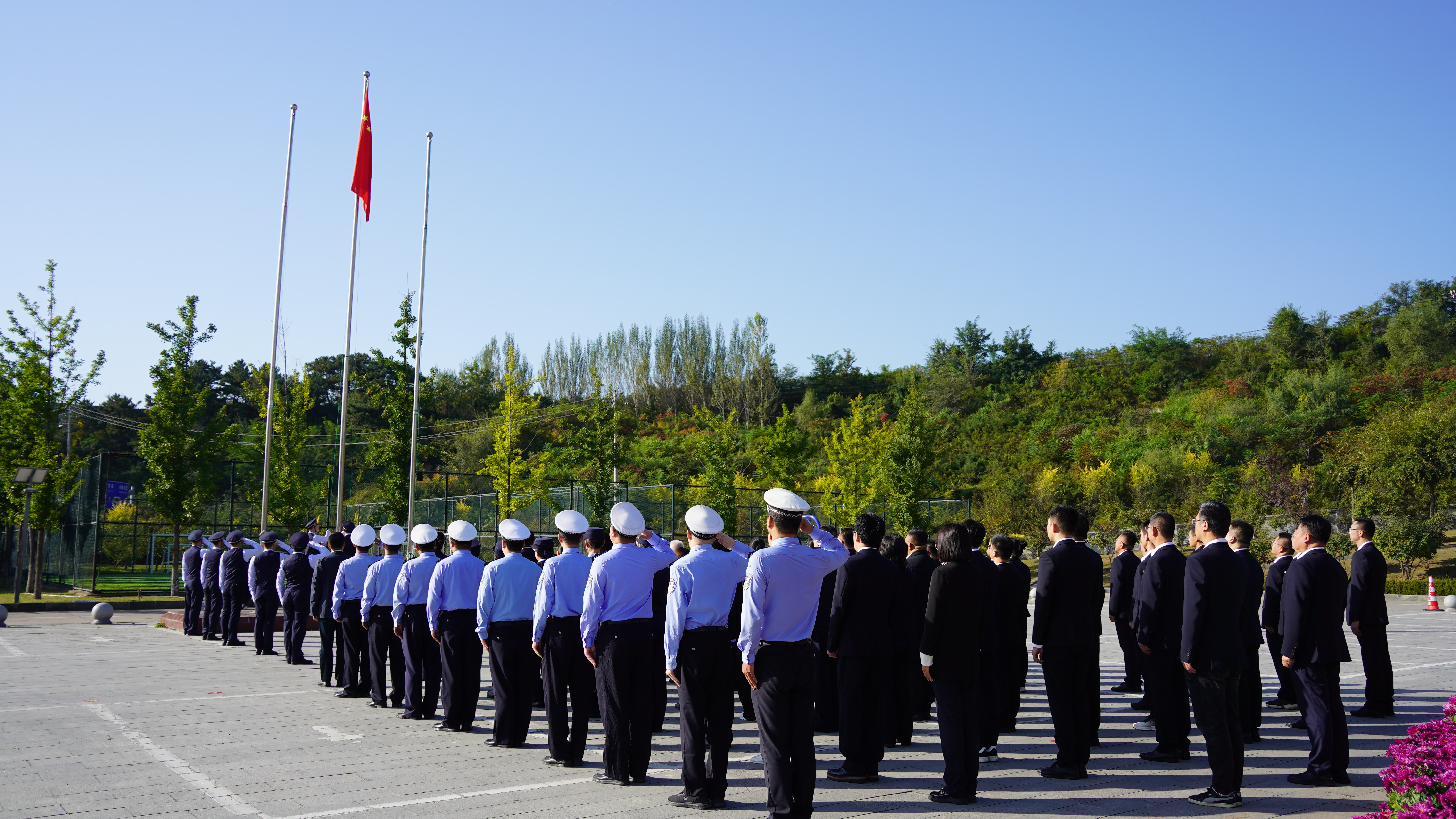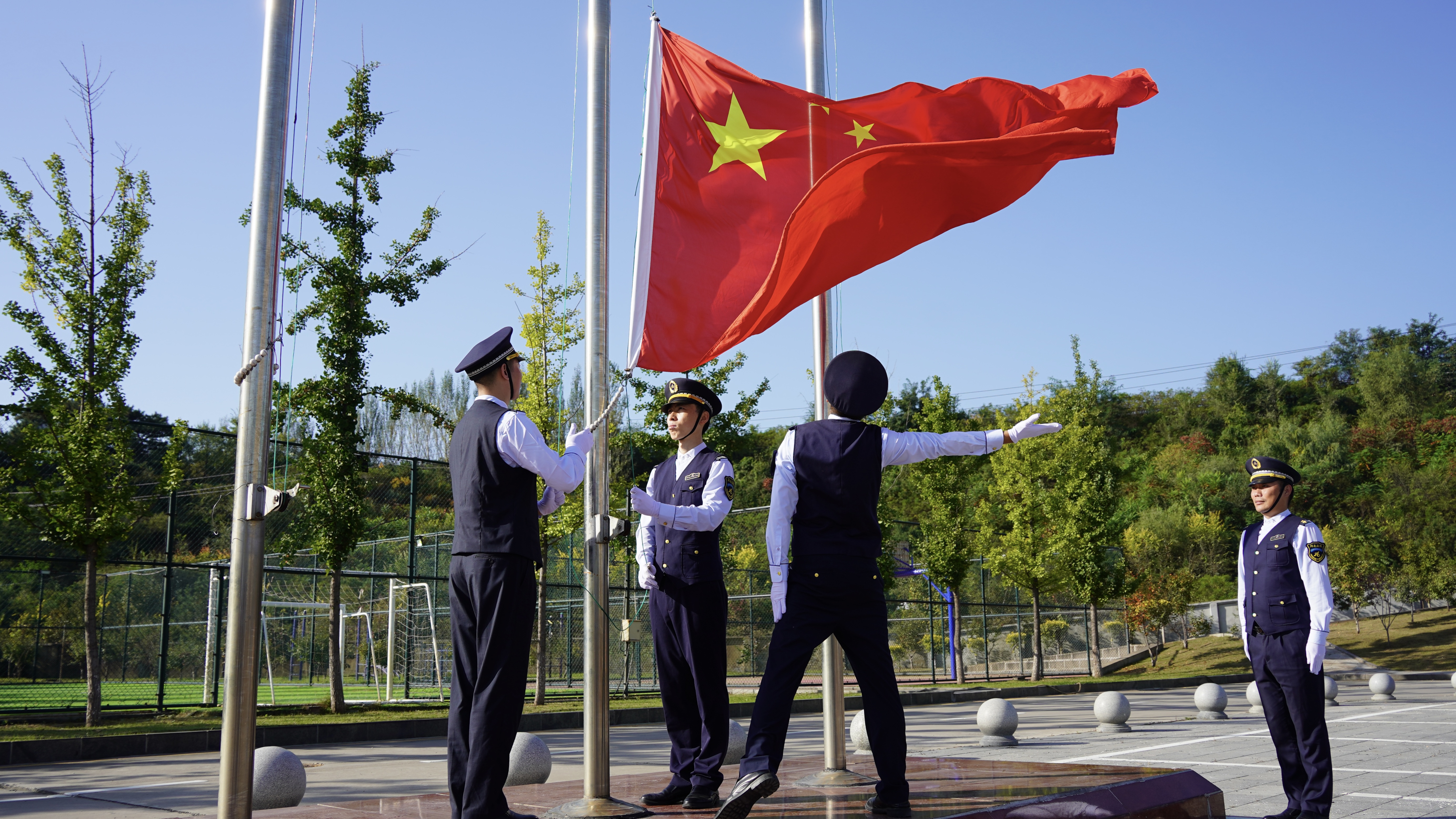 升旗仪式上,身姿挺拔的升旗手、护旗手迈着铿锵有力的步伐护送国旗进场。伴随着雄壮激昂的国歌,鲜艳的五星红旗冉冉升起,全体人员肃然而立,齐唱国歌,向国旗行注目礼,以最真挚的情感表达对伟大祖国的热爱与祝福。