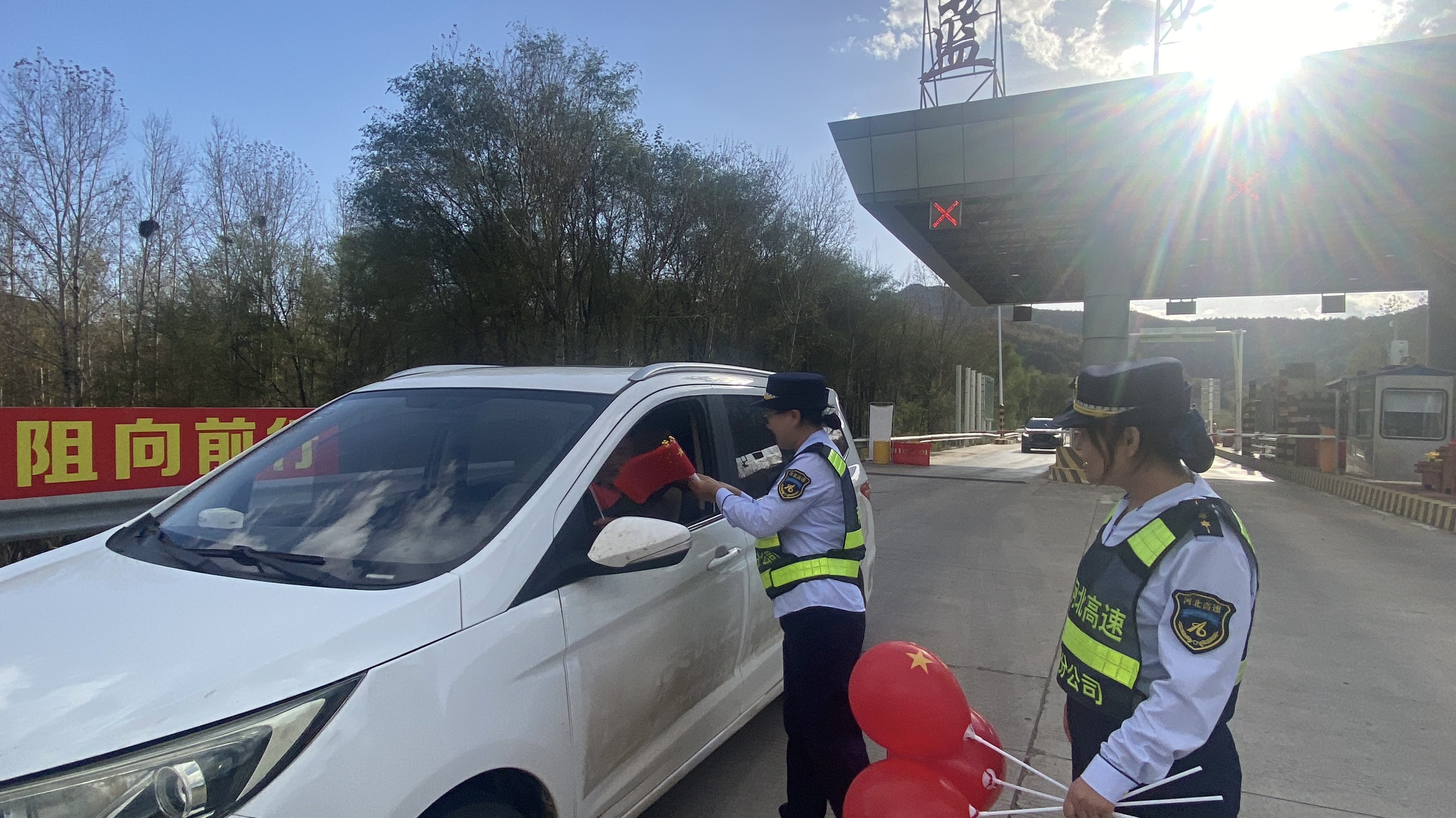 暖心服务,传递节日祝福。节日期间,收费站工作人员在确保安全畅通、提供优质服务的同时,还化身“祝福使者”,向过往的司乘朋友免费发放手持国旗和印有“国庆节快乐”、“我爱你中国”等字样、充满节日气息的红色气球。这一份份小小的礼物,承载着收费站全体员工对祖国的美好祝愿,也传递着对每一位旅途奔波者的温馨关怀。收到国旗和气球的司机师傅们脸上洋溢着惊喜与感动,纷纷为这一暖心举措点赞,有的还情不自禁地挥舞起小红旗,与工作人员互致节日问候,现场气氛温馨而热烈。