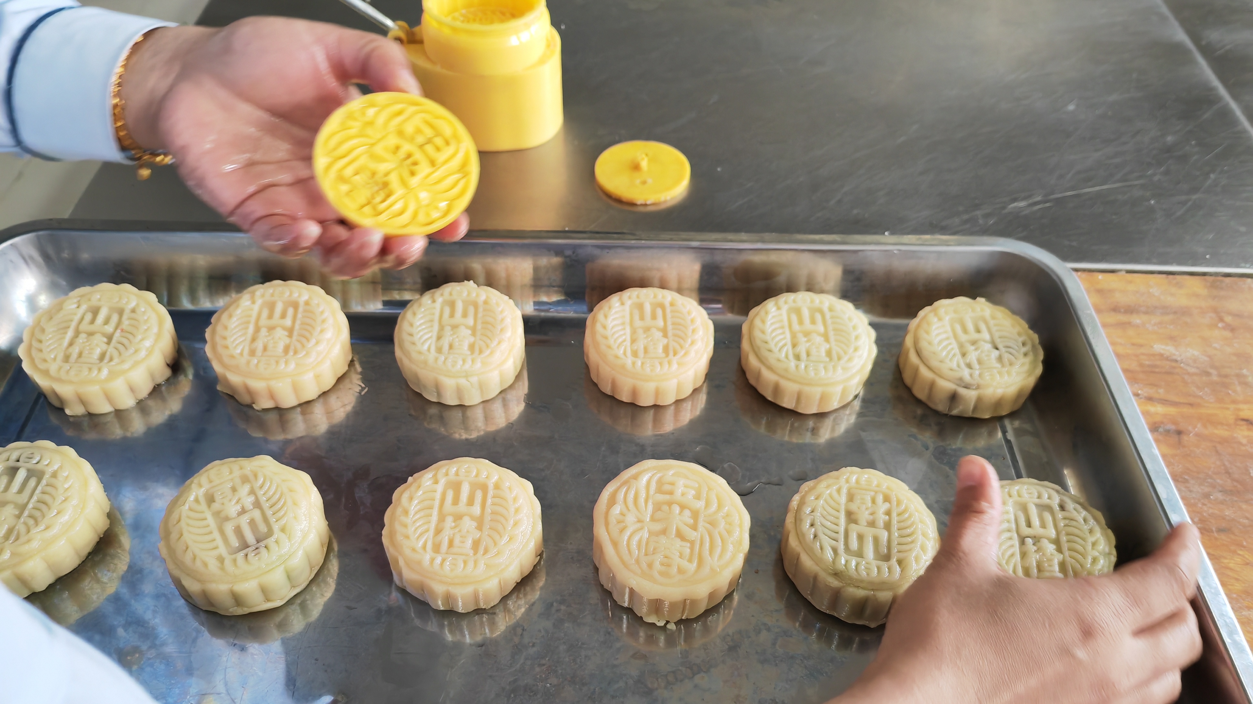 活动前,食堂已备好面粉、馅料、模具等食材和工具。党员干部带头开展准备工作,清洗用具、调配面团、分装馅料,以实际行动发挥先锋模范作用。制作过程中,大家分工协作,揉面、包馅、压模,动作由生疏渐至熟练。有经验的职工主动分享技巧,同事们认真观摩学习,现场欢声笑语,气氛温馨融洽。随着一枚枚印有“中秋快乐”“浓情中秋”字样的月饼逐渐成型,其中既寄托着对职工的美好祝愿,也承载着对司乘一路平安的深情祝福。