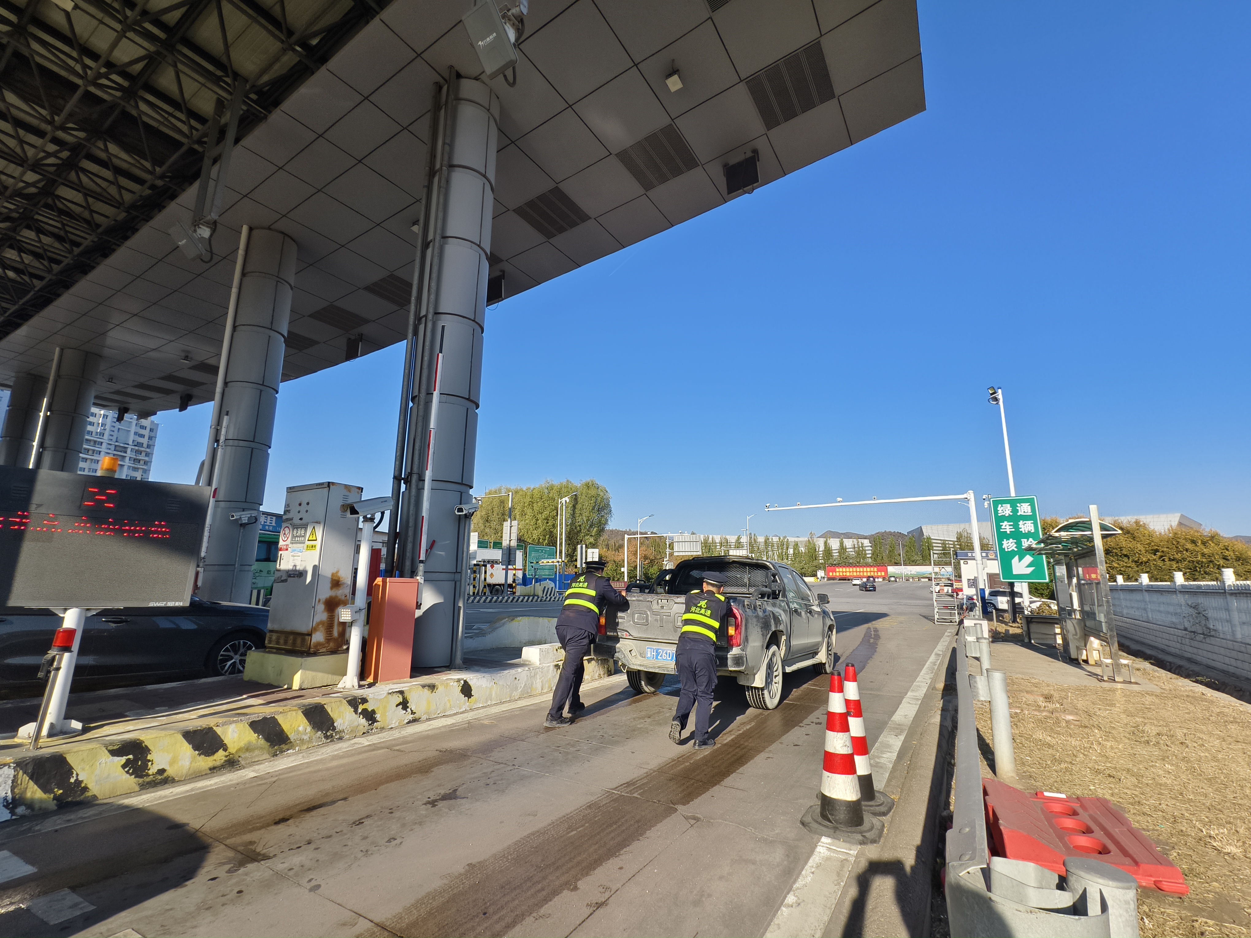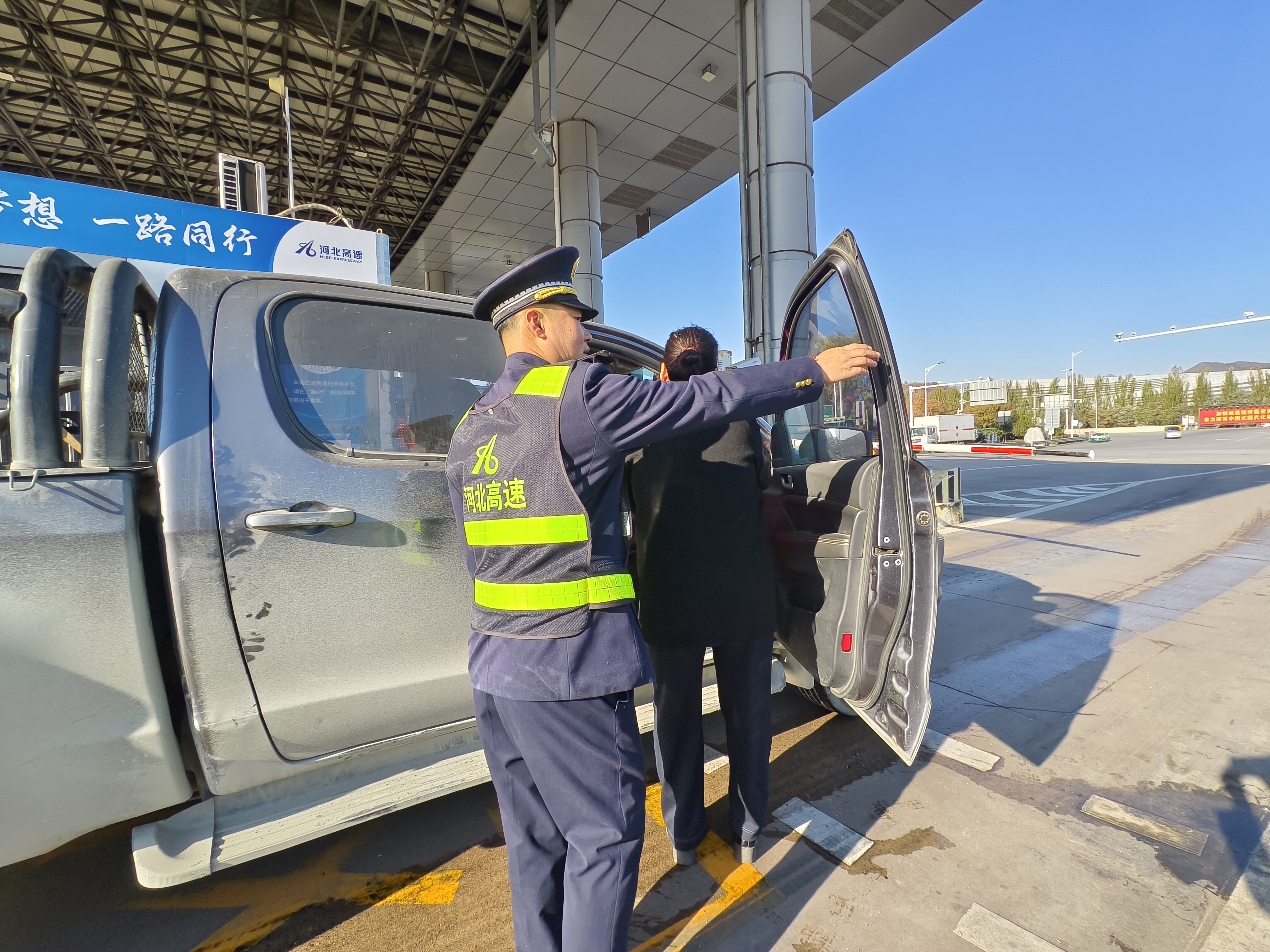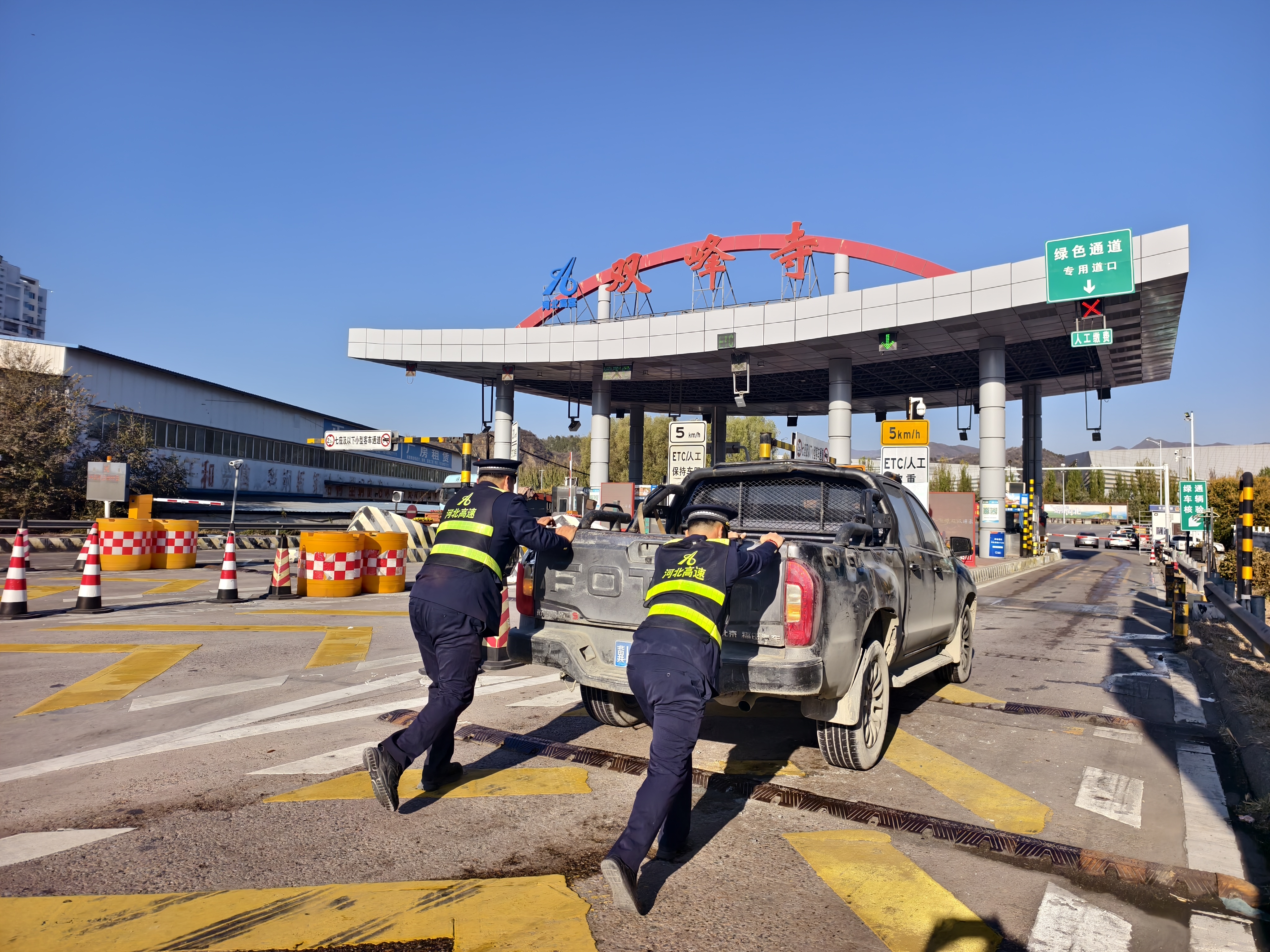 10月29日上午,一辆冀H26D**皮卡车在驶出双峰寺收费站时突发故障,停滞于车道中央无法启动,严重影响后方车辆通行。双峰寺收费站工作人员迅速反应、主动协助,合力将车辆推移至安全区域,及时化解现场拥堵。