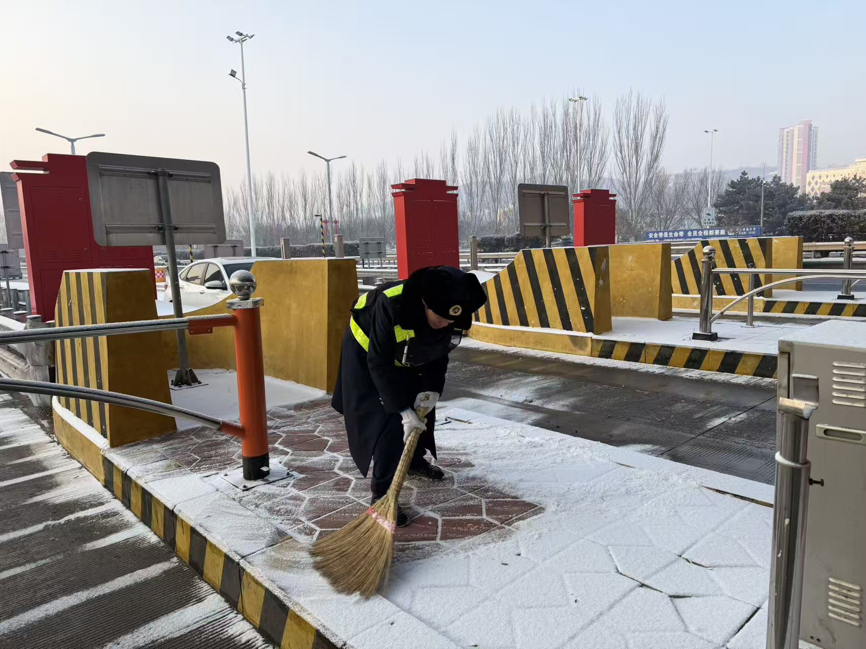 雪情即命令,保畅即责任。收费站全体人员按照“分区作业、分片包干、协同推进”原则,迅速清点并分发除雪铲、扫帚、融雪剂等应急物资,顶风冒雪、不畏严寒,奔赴各自责任区域。大家重点对收费车道、广场出入口等易积雪结冰路段进行清扫,并及时撒布融雪剂,防止路面结冰。针对降雪强度变化,动态调整作业节奏,科学调配人员设备,确保除雪保畅工作高效有序开展。