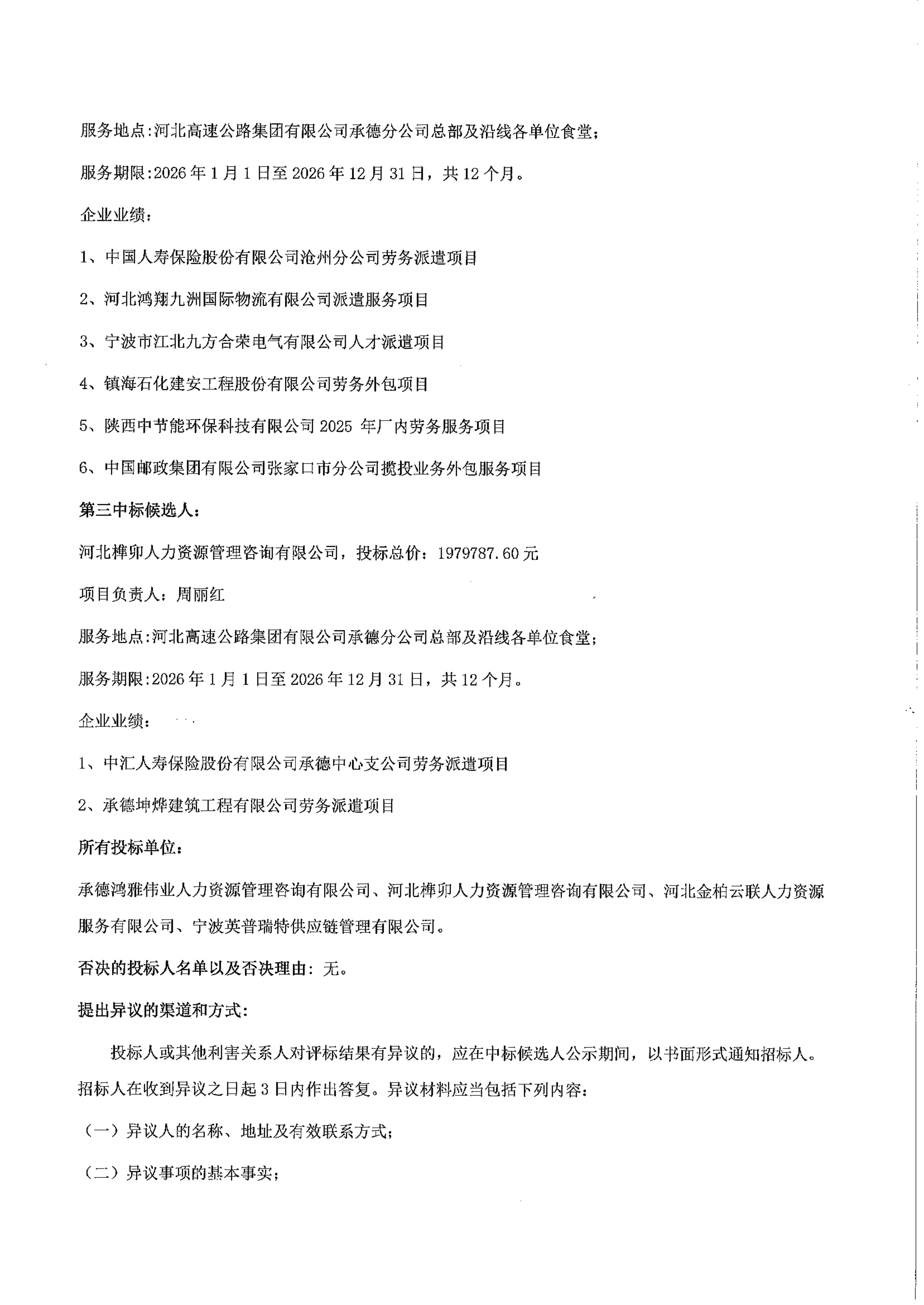 河北高速公路集团有限公司承德分公司2026年劳务外包服务项目中标候选人公示