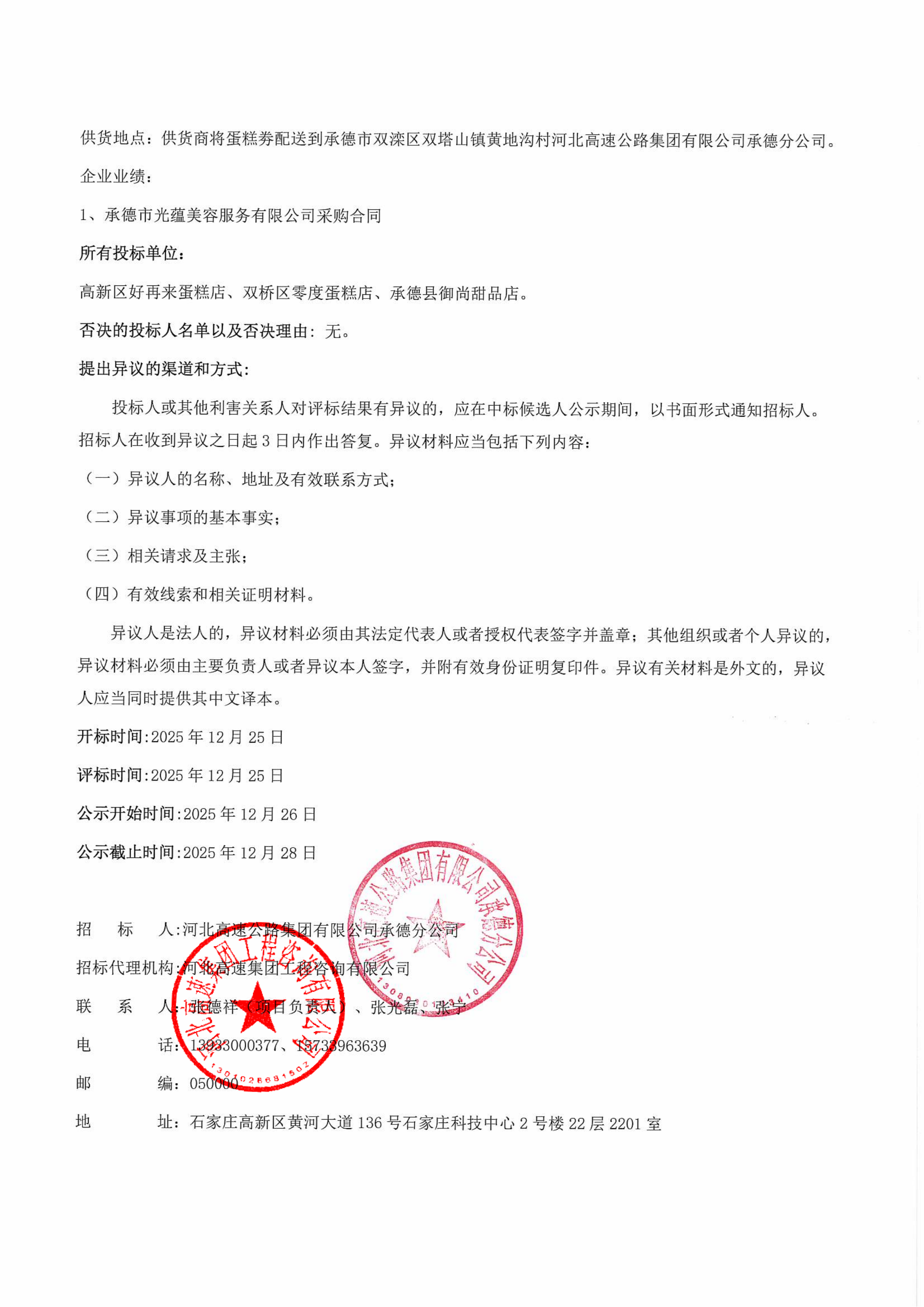 河北高速公路集团有限公司承德分公司工会委员会 2025年会员生日蛋糕采购项目(二次)中标候选人公示