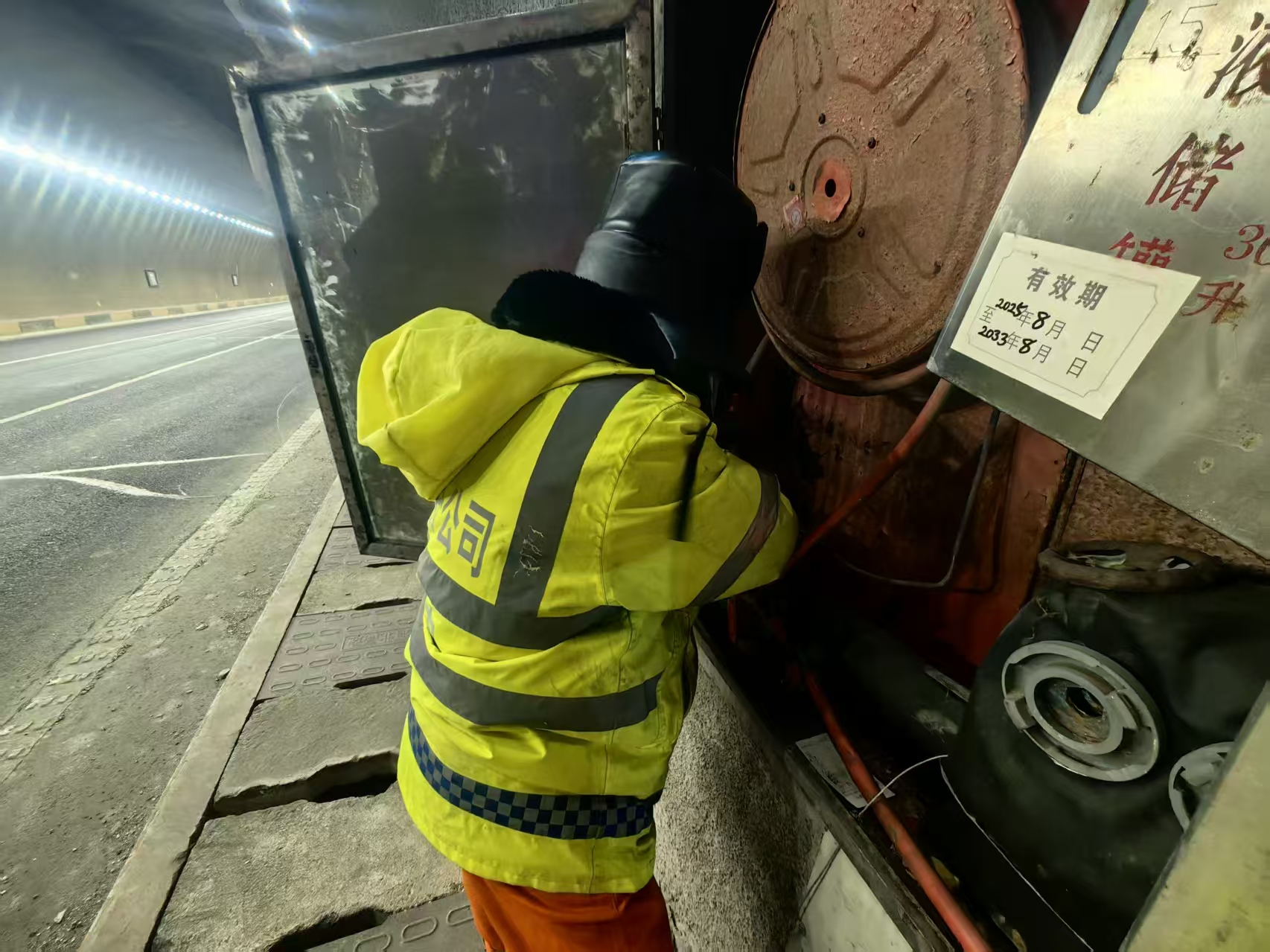 抵达隧道后,机电人员与外委单位紧密配合,迅速展开排查。一组人员直奔水泵房,仔细检查电机运转状态及叶轮完好情况,确保设备运行正常;另一组人员对隧道内消防橱窗进行逐一排查,重点检查管道接口与阀门是否存在渗漏。经细致勘察,确认故障原因为18号箱阀门损坏,导致水从接口处渗漏。