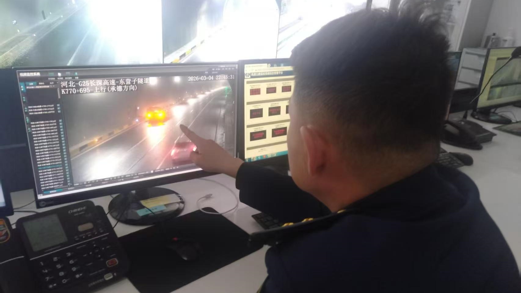 3月4日22时45分,监控室值班人员在视频巡查中发现东营子隧道承德方向快车道内一辆轿车开启双闪停滞不前。此时正值降雪天气,路面湿滑、视线受限,后方车辆纷纷减速避让,存在安全隐患。监控员立即锁定车辆位置并上报联指中心,同时通过隧道广播发布安全提示,变更车道指示器并发布警示,引导车辆减速通行,并迅速联系交警及应急部门。附近巡查的应急人员赶赴现场后,设置警戒区域并协助驾驶员处置故障。0时48分,故障车辆安全驶离隧道,交通恢复正常。