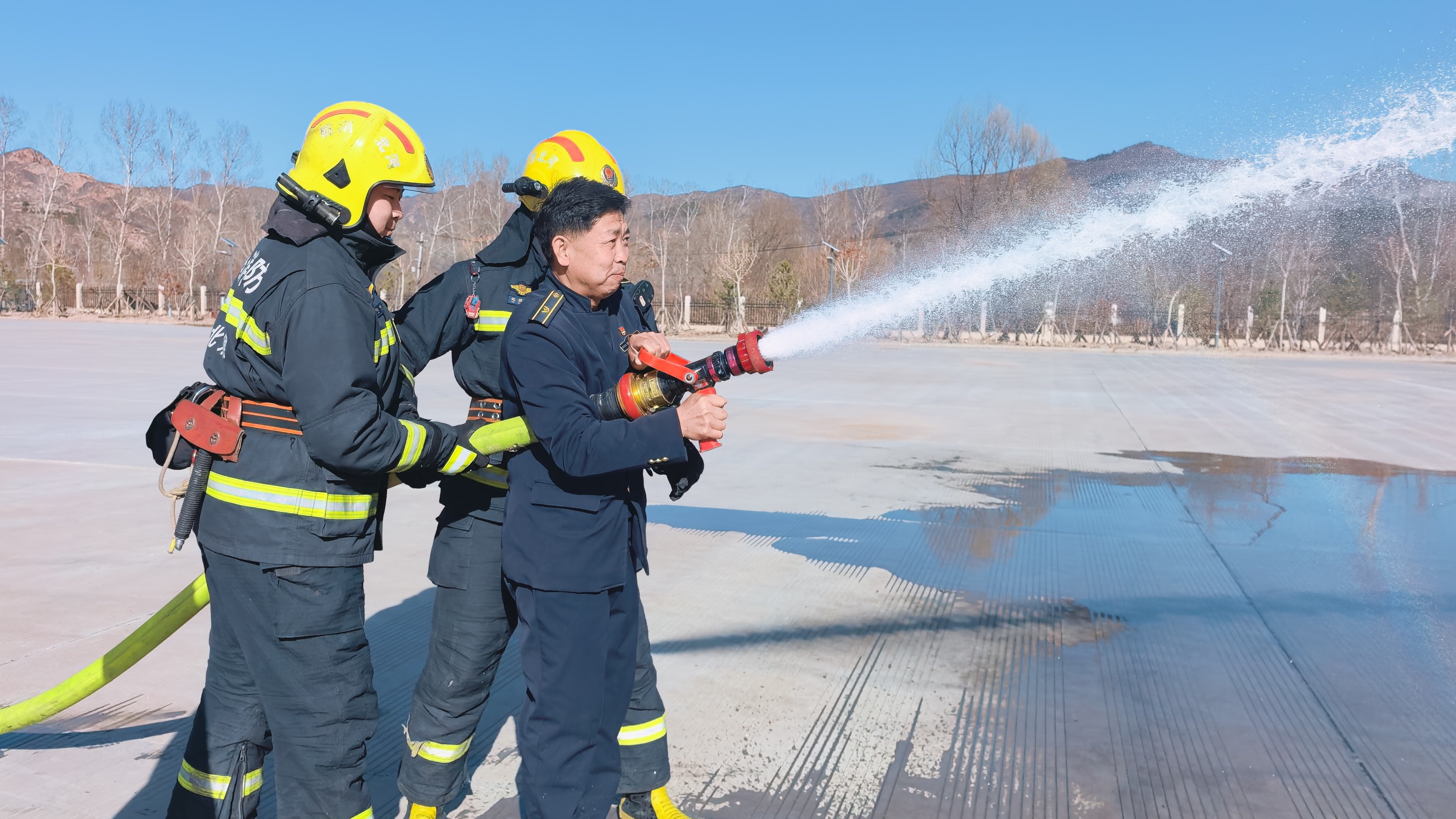 在灭火实操环节,消防指战员现场演示了消防水带铺设、连接接口、开启阀门等标准操作流程,并指导职工分组进行实战操作。职工们两人一组,合力操作消防水带,向目标区域喷射水柱,模拟灭火作业。通过反复练习,大家掌握了水带展开、喷射角度控制、站位调整等操作要点,提升了真实火场环境下的应对能力。