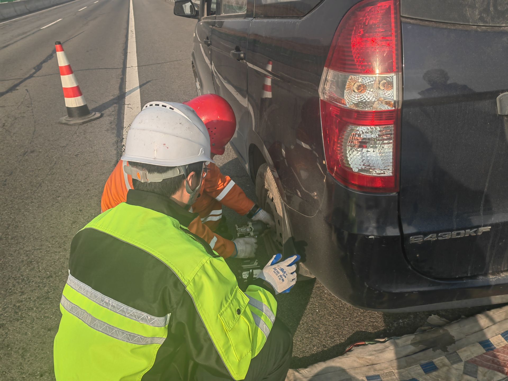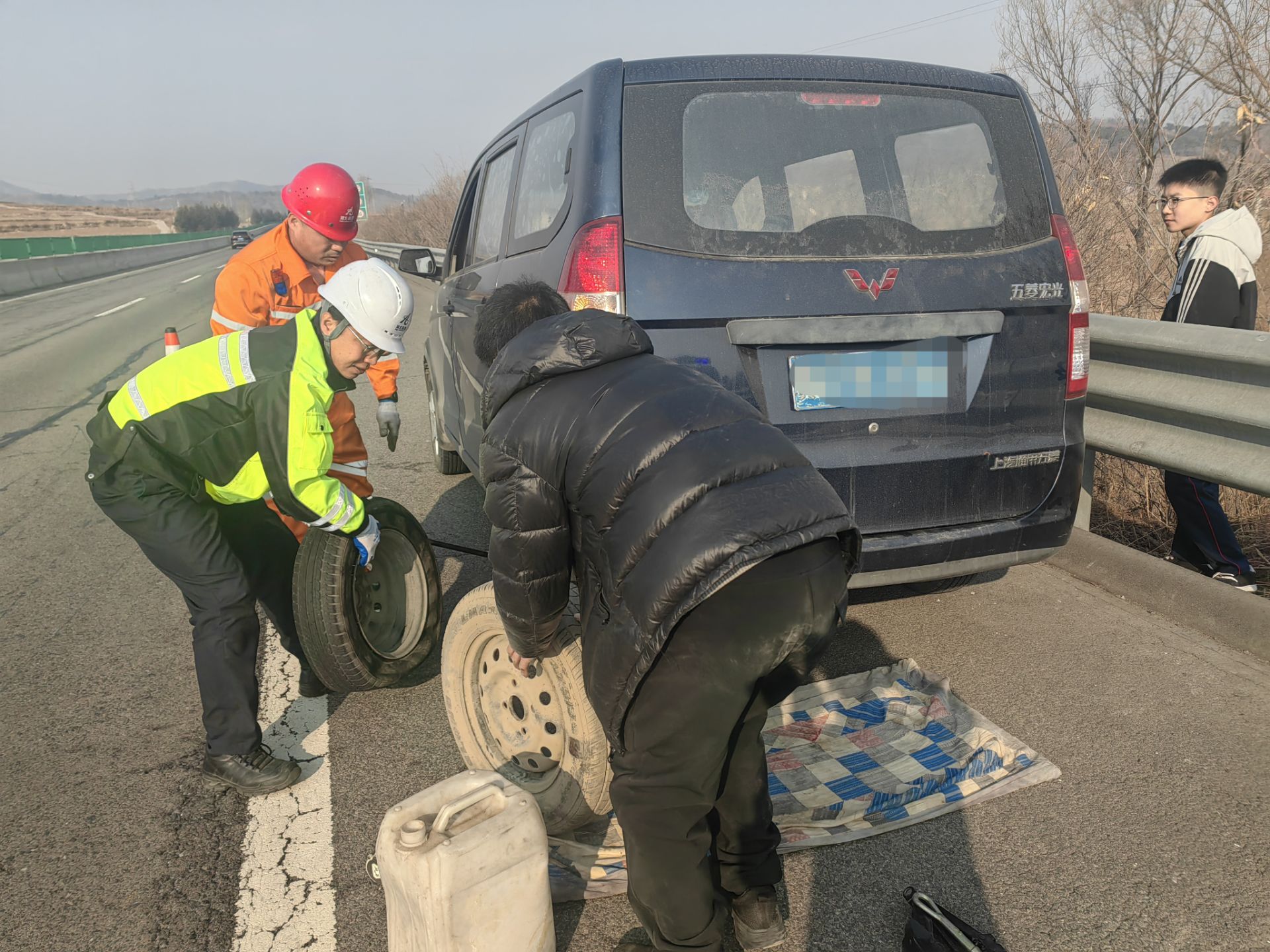 接到通知后,平泉大队人员立即携带维修工具赶往现场。8时05分顺利抵达事发地点,队员们第一时间做好安全警示防护,俯身支起千斤顶,帮助拆卸破损轮胎、安装备用轮胎,仅用几分钟就顺利完成换胎作业,使车辆恢复正常行驶条件。随后,队员耐心向司机讲解高速行车注意事项、轮胎日常检查以及爆胎应急处置等安全知识,并叮嘱其就近前往专业维修点进行全面检修,确保后续行车安全。司乘人员紧握队员的手,对应急队员的暖心帮助再三致谢,对高速公路保通保畅人员主动为民排忧的行为连连称赞。
