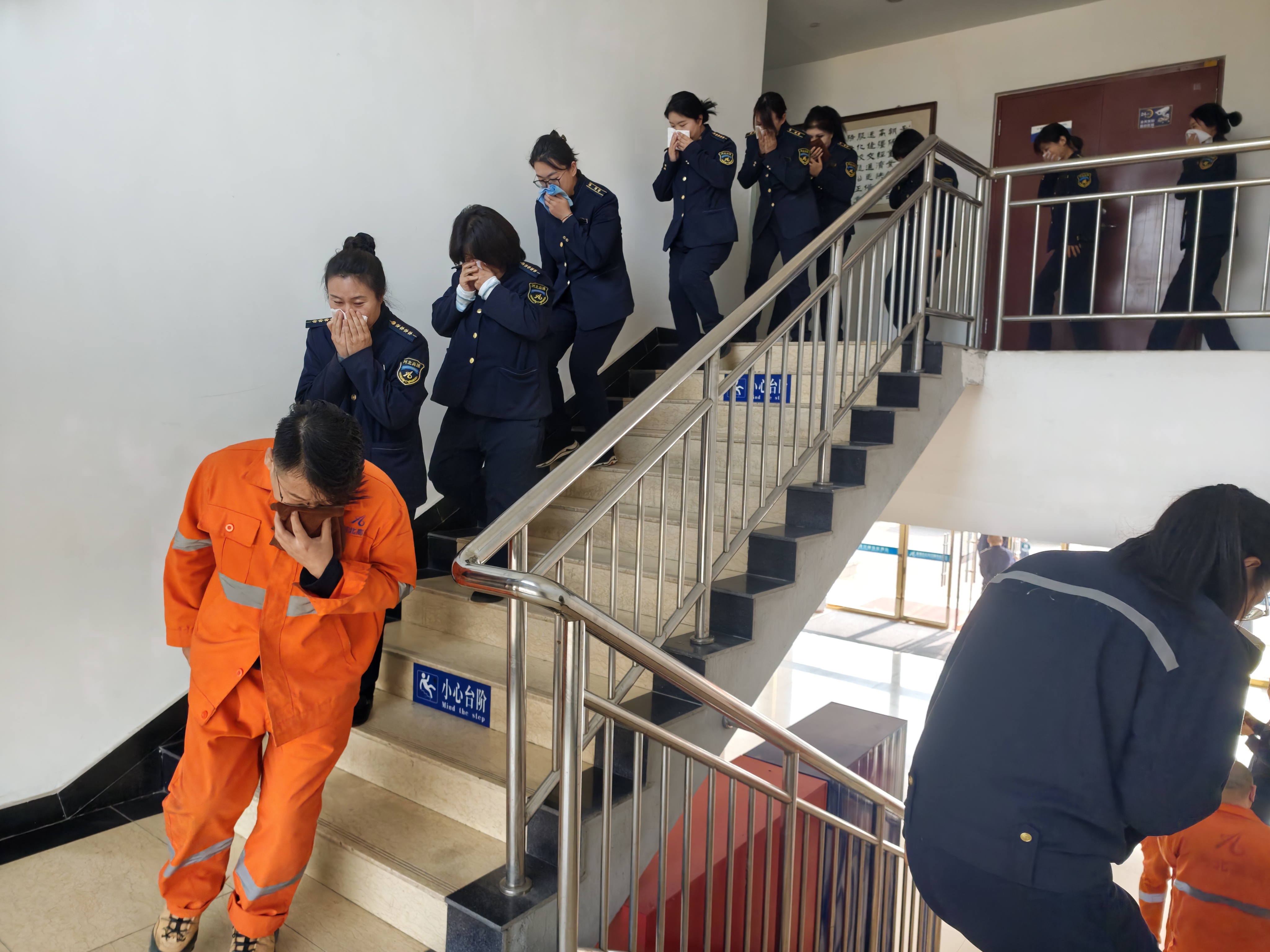 随着演练警报响起,消防逃生应急演练正式启动。模拟宿办区突发火情,现场烟雾弥漫,参演职工迅速反应,在安全员统一指挥下,弯腰低姿、捂住口鼻,按照预定疏散路线快速、有序、安全地撤离至宿办楼前安全集结点。整个过程紧张有序、衔接顺畅,无一人滞留、无一人摔倒。